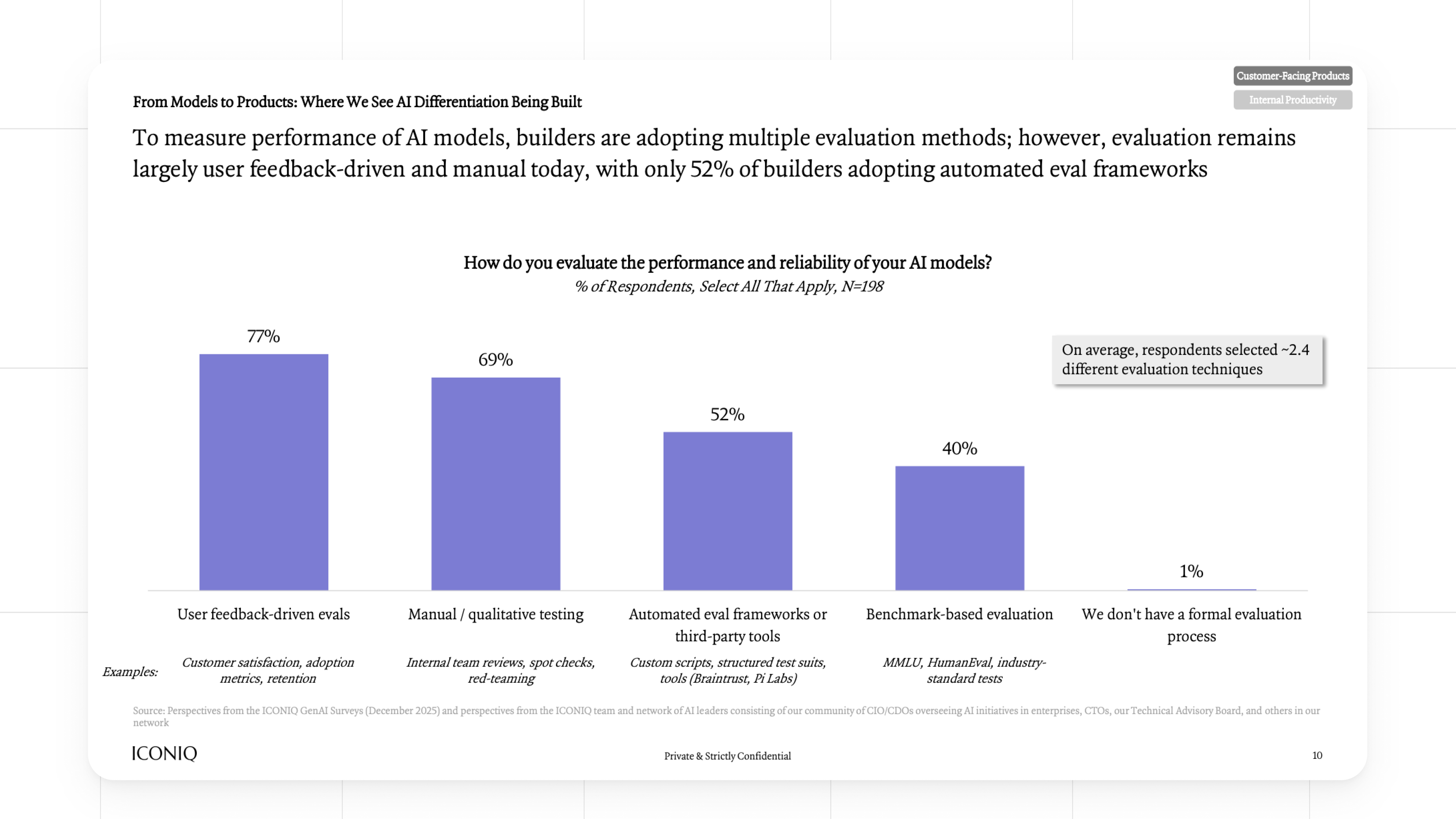 ICONIQ's data shows only 52% of companies use automated evaluation frameworks. The top evaluation methods are user feedback (77%) and manual testing (69%).