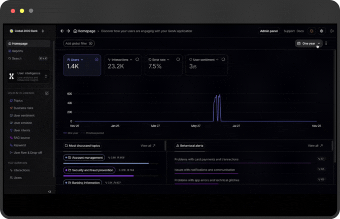 We added a new search function that lets users find any insight across Nebuly, from interactions to topics or intents, without needing to know where it lives.
